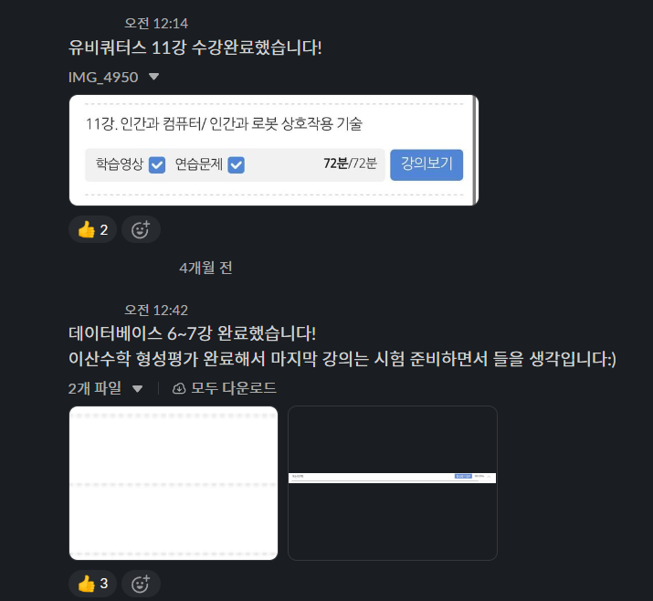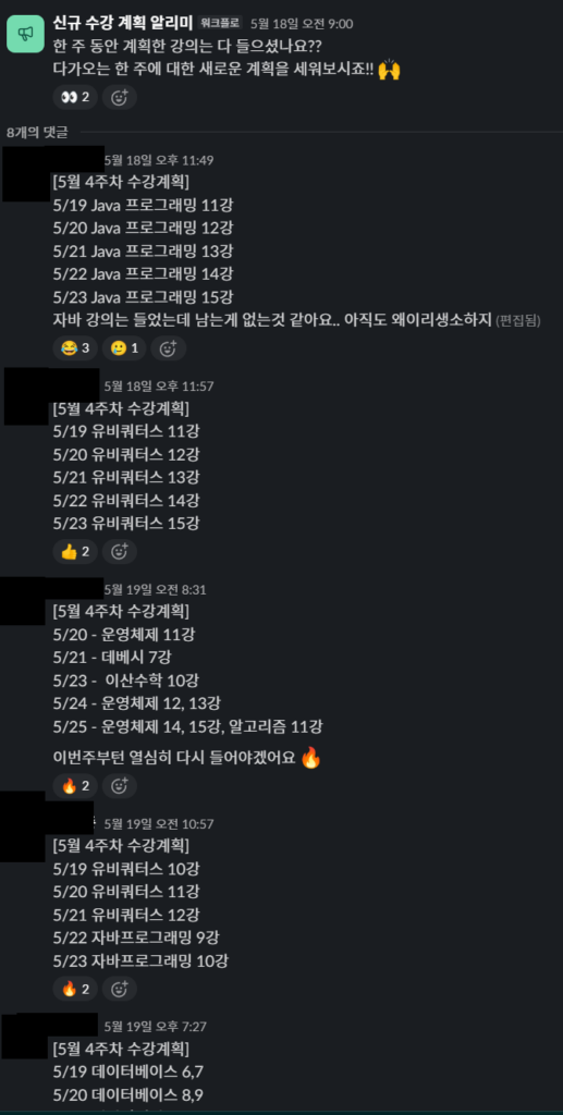 방통대 컴퓨터과학과 과정 중 참여한 커뮤니티에서 ‘1주5강 챌린지’라는 활동을 진행했다. 매주 수강 목표를 세우고, 매일 강의를 듣고 인증하는 방식으로 학습 습관을 유지하는 프로그램이다.