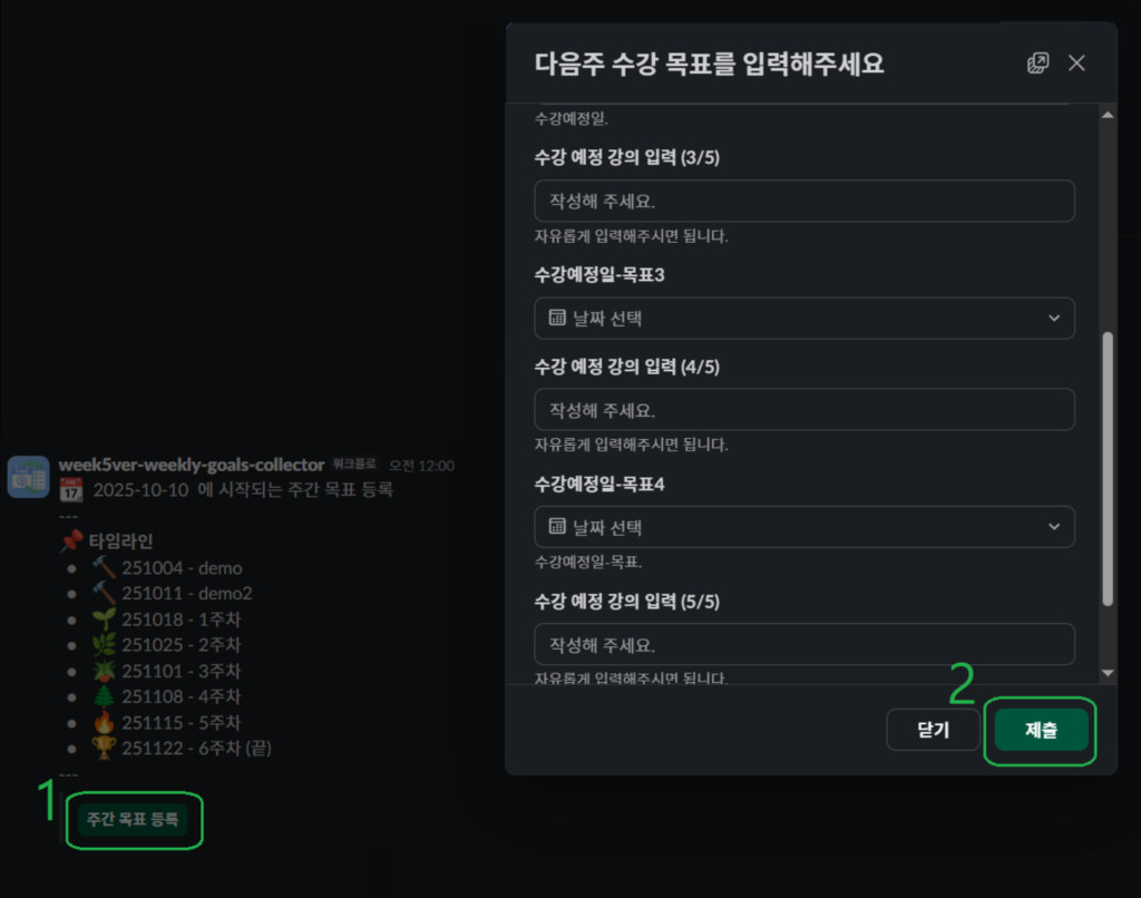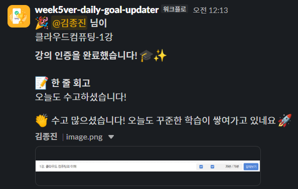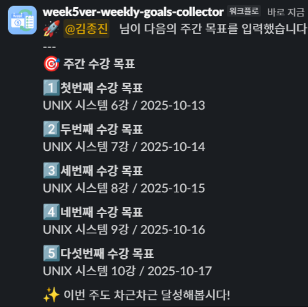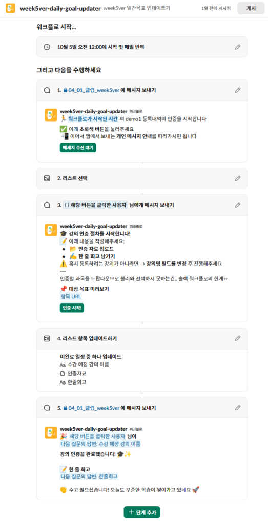 - 방통대 학습 커뮤니티의 ‘1주5강 챌린지’를 Slack 워크플로우로 자동화하여 주간 목표 등록·일간 인증 과정을 간소화함.