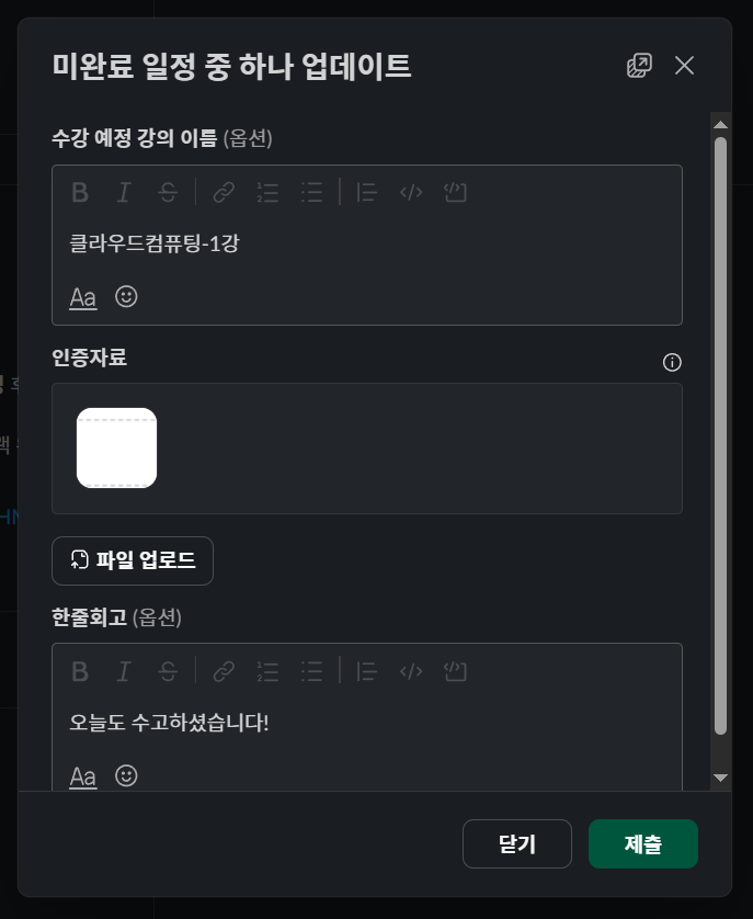 - 각 수강목표에 대해 인증자료 및 코멘트를 받아 상태 업데이트