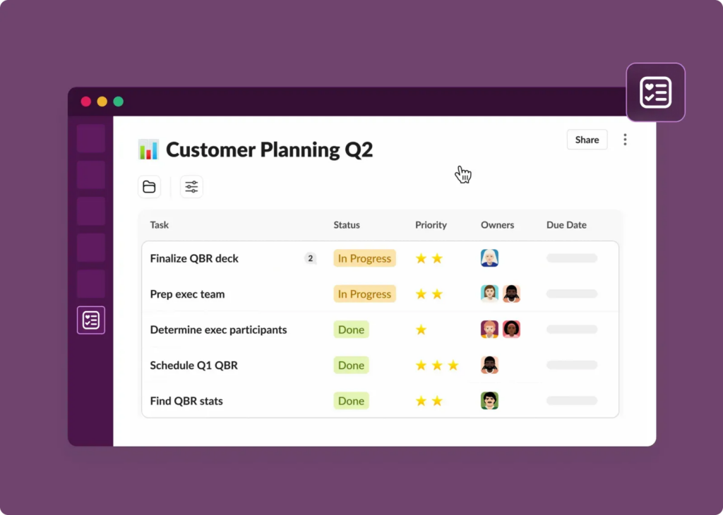 리스트는 Slack에서 이루어지는 업무를 정리하고 협업하는 데 도움이 되며, 리스트를 사용하여 작업 관리, 프로젝트 작업 추적 등을 할 수 있습니다. 처음부터 리스트를 새로 만들거나 사용자 지정 가능한 템플릿을 선택하여 시작한 다음에 작업을 추가하고 리스트 항목에서 직접 다른 사람들과 협업하세요.