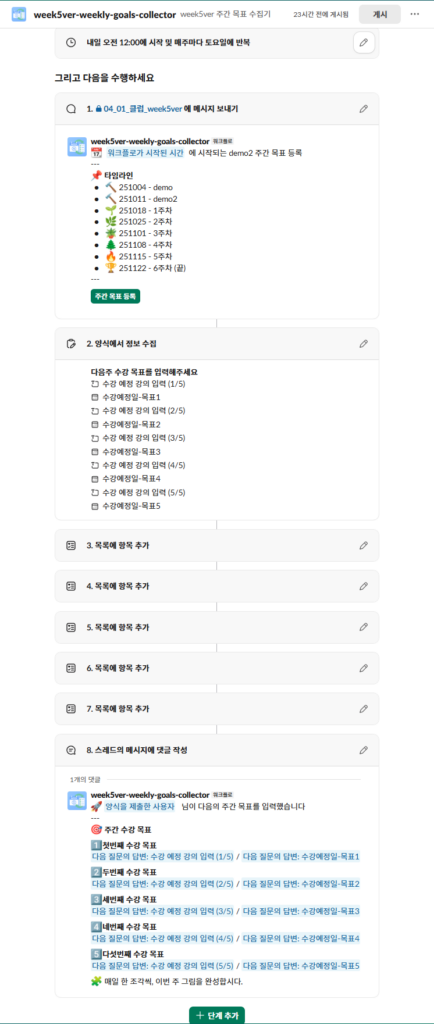 - 슬랙 리스트: 워크플로우나 수동 입력을 통해 생성된 항목(예: 목표, 할 일, 인증 내역 등)을 슬랙 내에서 테이블처럼 관리·업데이트할 수 있는 목록 기능.