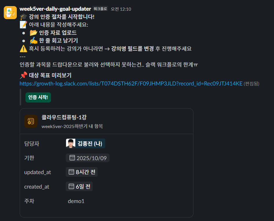 "text": " 후 진행해주세요\n---\n인증할 과목을 드랍다운으로 불러와 선택하지 못하는건.. 슬랙 워크플로의 한계ㅠ\n\n",